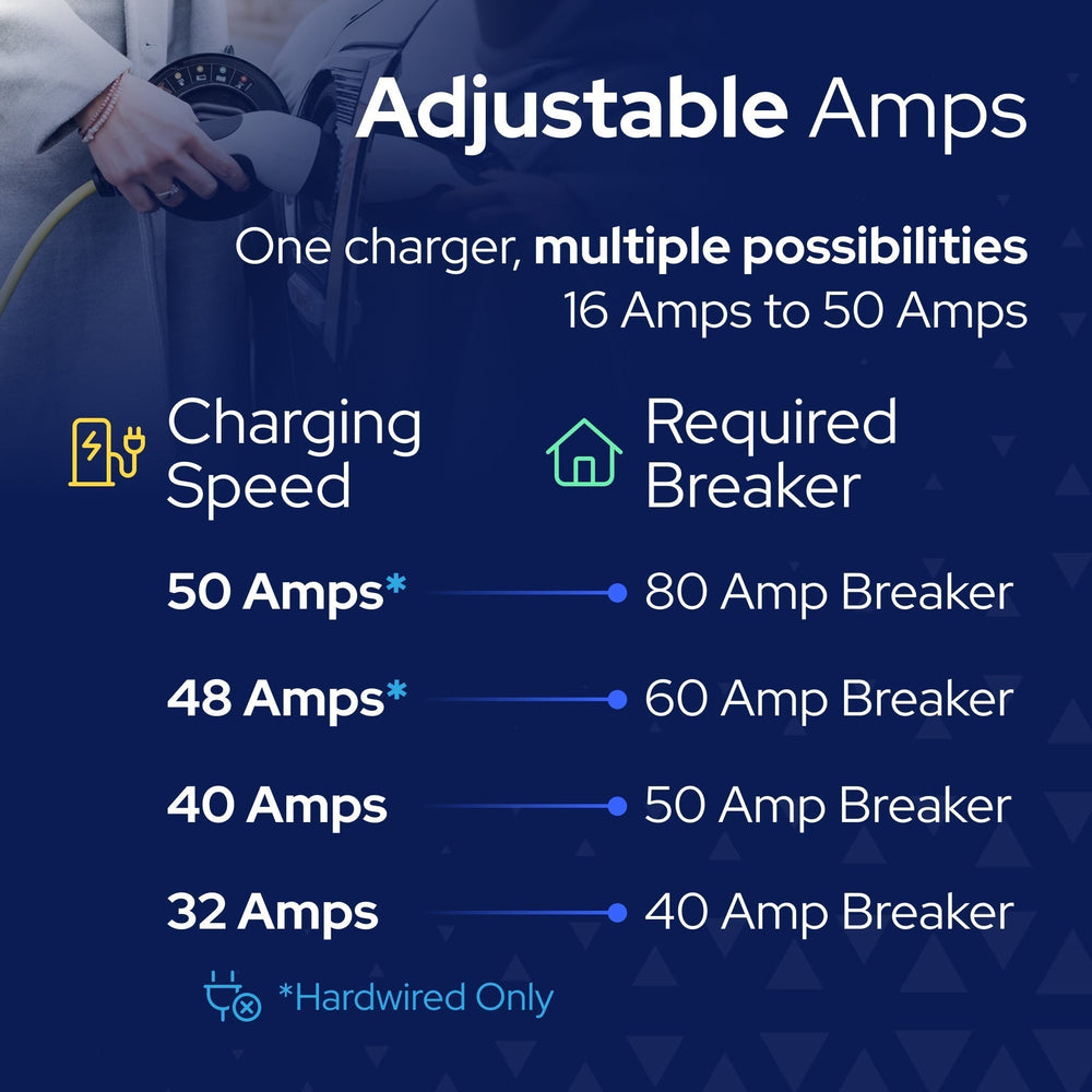 - Hardwired: Accommodates circuit breaker ratings from 20 to 80 amps, enabling up to 50 amps of rapid charging.